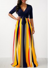 - Half Sleeve Striped V Neck Rainbow Color Dress